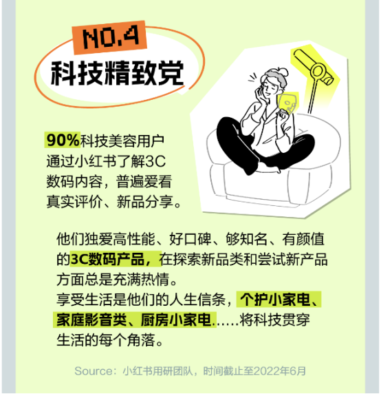 90%科技美容用户通过小红书了解3C数码内容,个护小家电、家庭影音类、厨房小家电都是他们爱看的类型,高性能、好口碑、够知名、有颜值,才能真正打动他们。