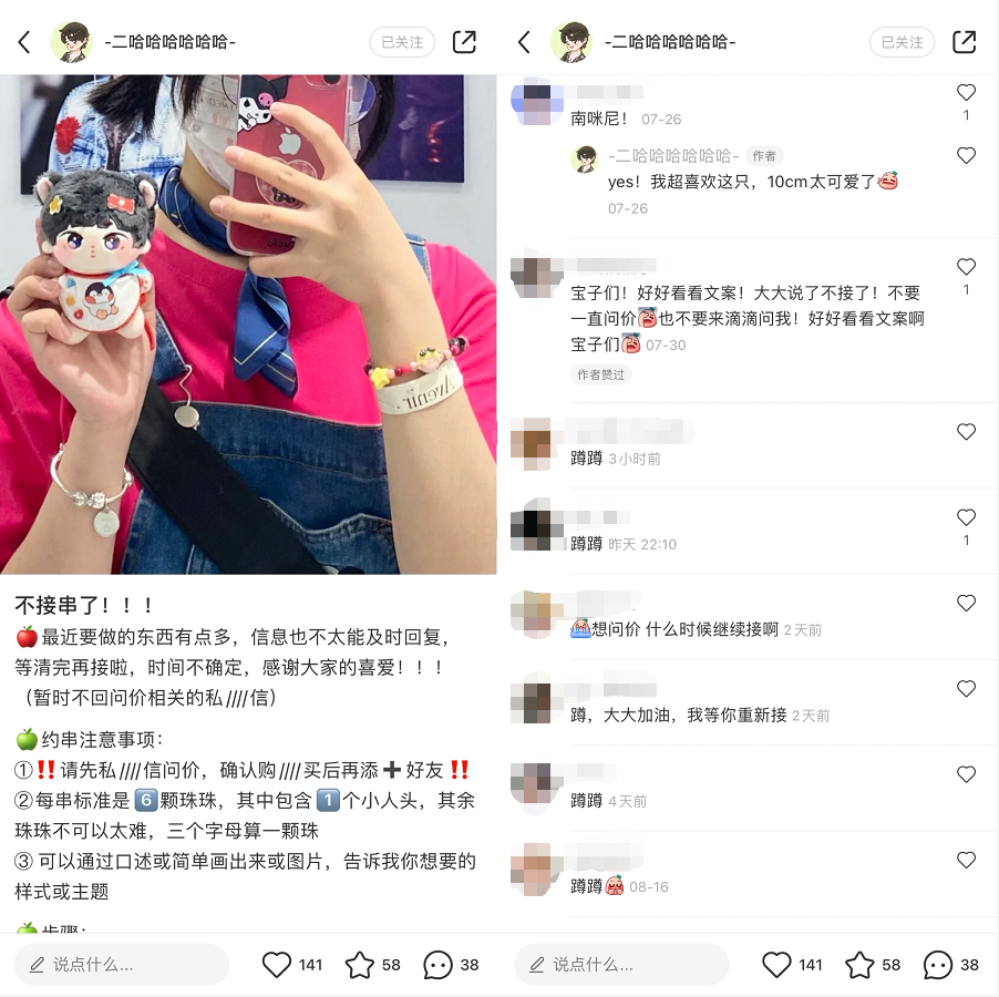 置顶于“哈哈”小红书主页的,是一篇标题为“不接串了!”的笔记。由于工时排期等问题,“哈哈”决定暂停接单,但在评论区仍然有用户排队蹲单。