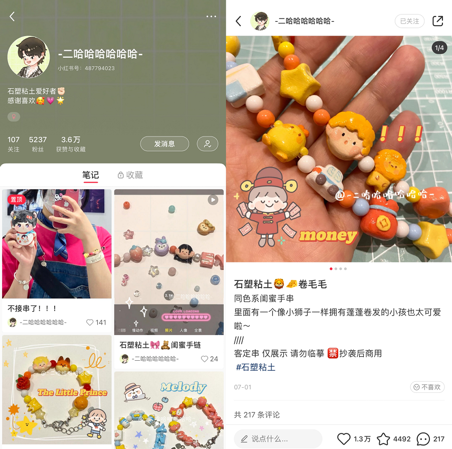 “-二哈哈哈哈哈哈-”(下文简称“哈哈”)就是一位石塑粘土爱好者,她从今年5月开始在小红书分享内容,迄今为止粉丝量达到5229,单篇笔记最高点赞量达到1.3万。
