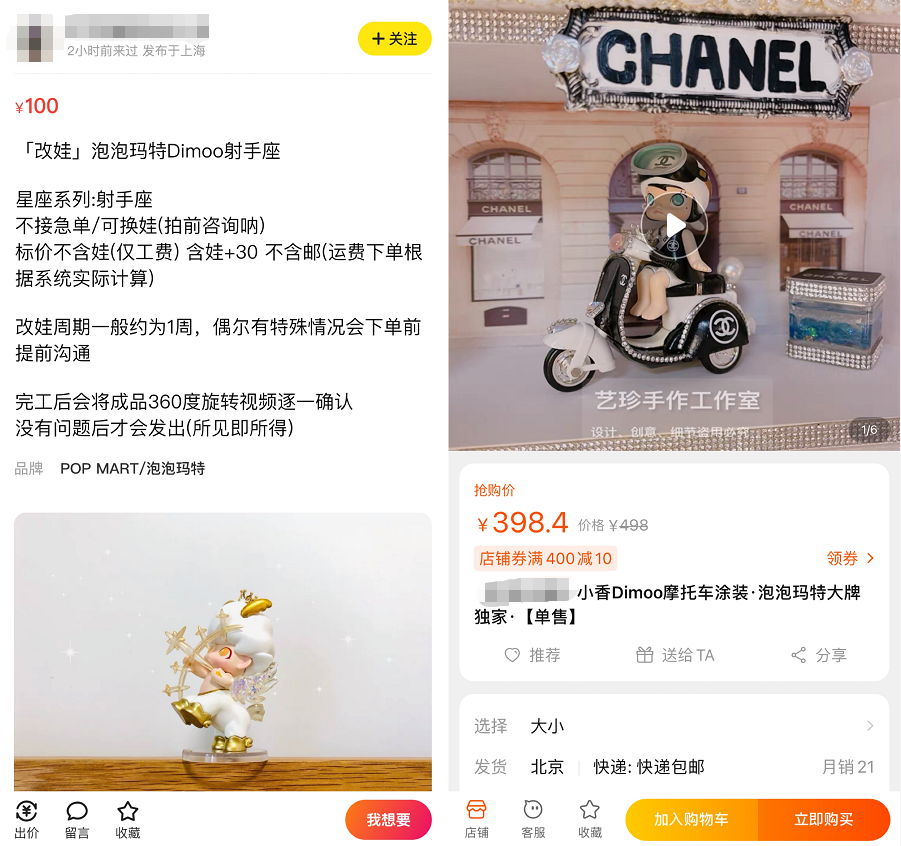 但是仍然有不少博主冒着侵权风险,选择接单改娃。在淘宝、咸鱼等平台,单个泡泡玛特改娃的报价在100-400元不等,部分重工款可以私信询价。