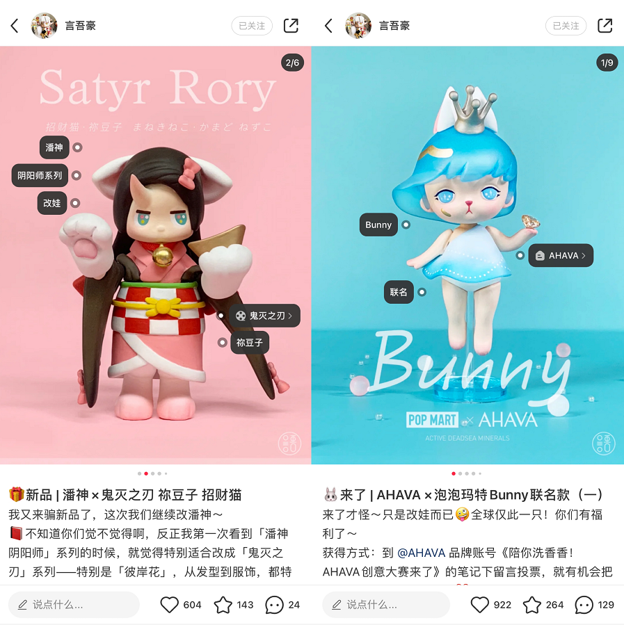 截至目前,“言吾豪”曾与护肤品牌AHAVA、网易游戏等多品牌合作过联名款改娃。这类用于商业宣传上的改娃,需要得到泡泡玛特的授权允许。