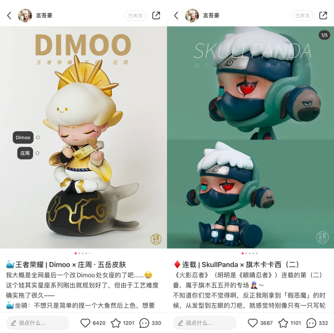 目前,“言吾豪”的小红书粉丝达到3.1万,点赞收藏总量达到12.4万,相继发布Dimmo改庄周、Skull Panda改旗木卡卡西等作品,在小红书上均获得不俗的点赞量。除此之外,还有其他用户参考他的作品尝试自己改娃。