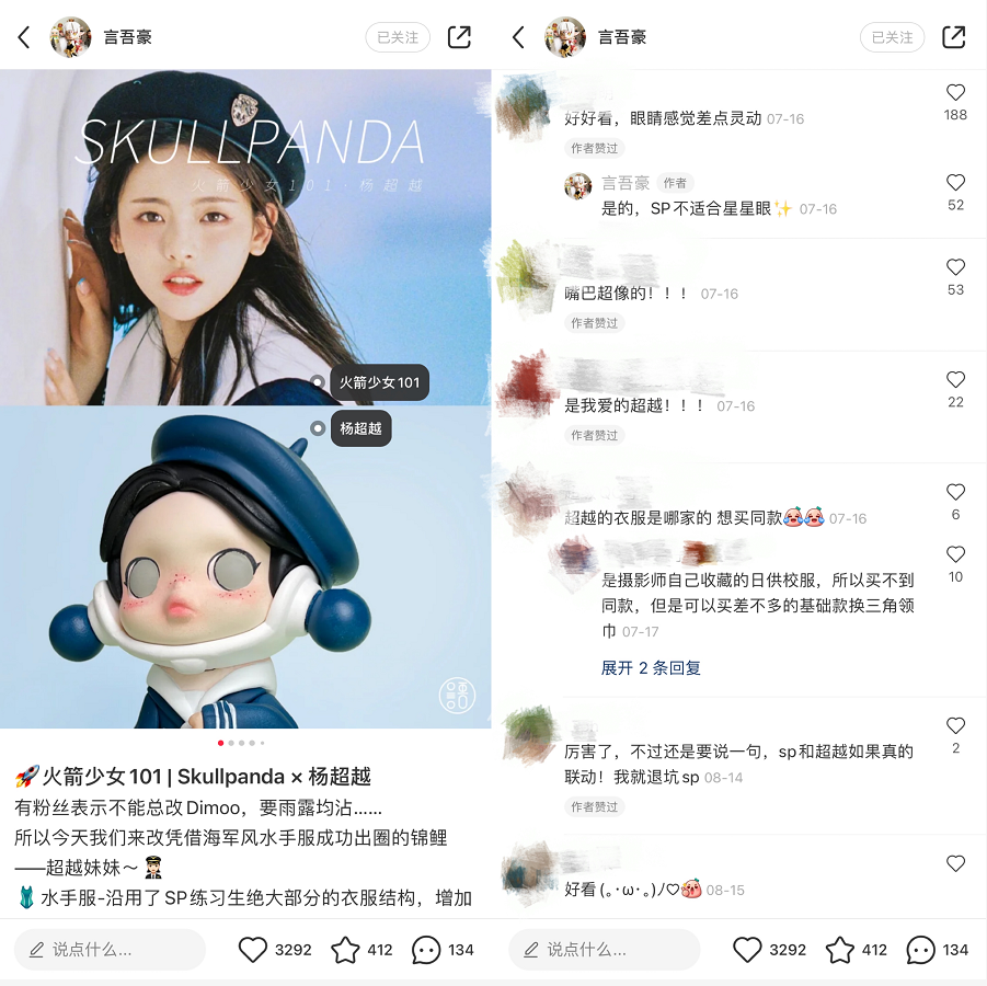 改娃师“言吾豪”在泡泡玛特旗下Skull Panda形象的基础上复刻了这张出圈图,截至发稿前,该篇笔记在小红书点赞量达到3292。