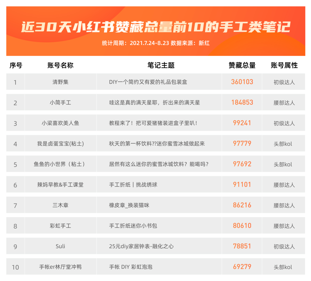 据新榜旗下新红数据显示,近一个月内小红书上热度较高的手工类笔记包括礼品包装盒DIY、手工折纸、橡皮章、手账DIY等多个主题。