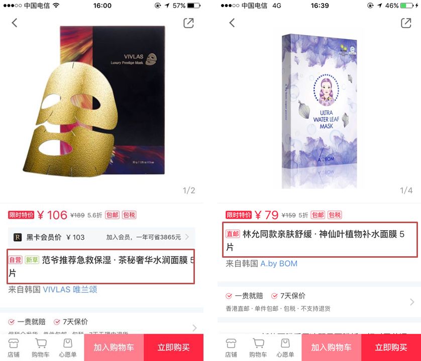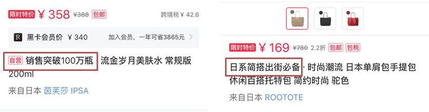 左边是来自淘宝全球购的文案,全是关键词的罗列,一坨文字粘在一起,目的是让消费者在搜索“控油、保湿、日本爽肤水、化妆水”这些词汇时,能让商品碰巧出现在搜索结果页上。