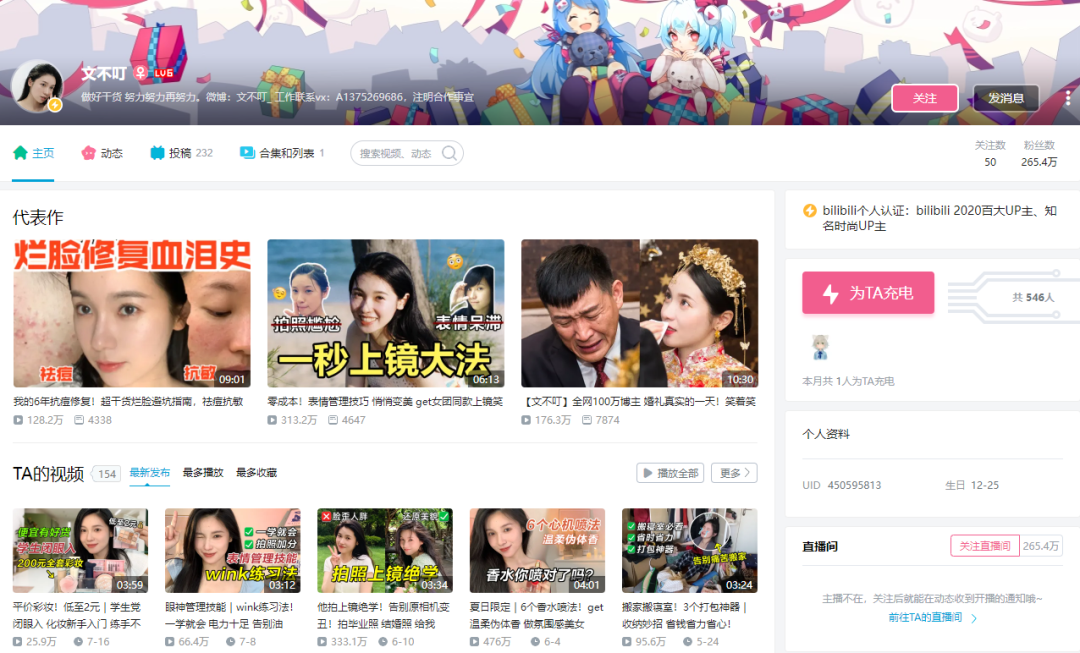 在B站,以“文不叮”的ID被265万粉丝认识