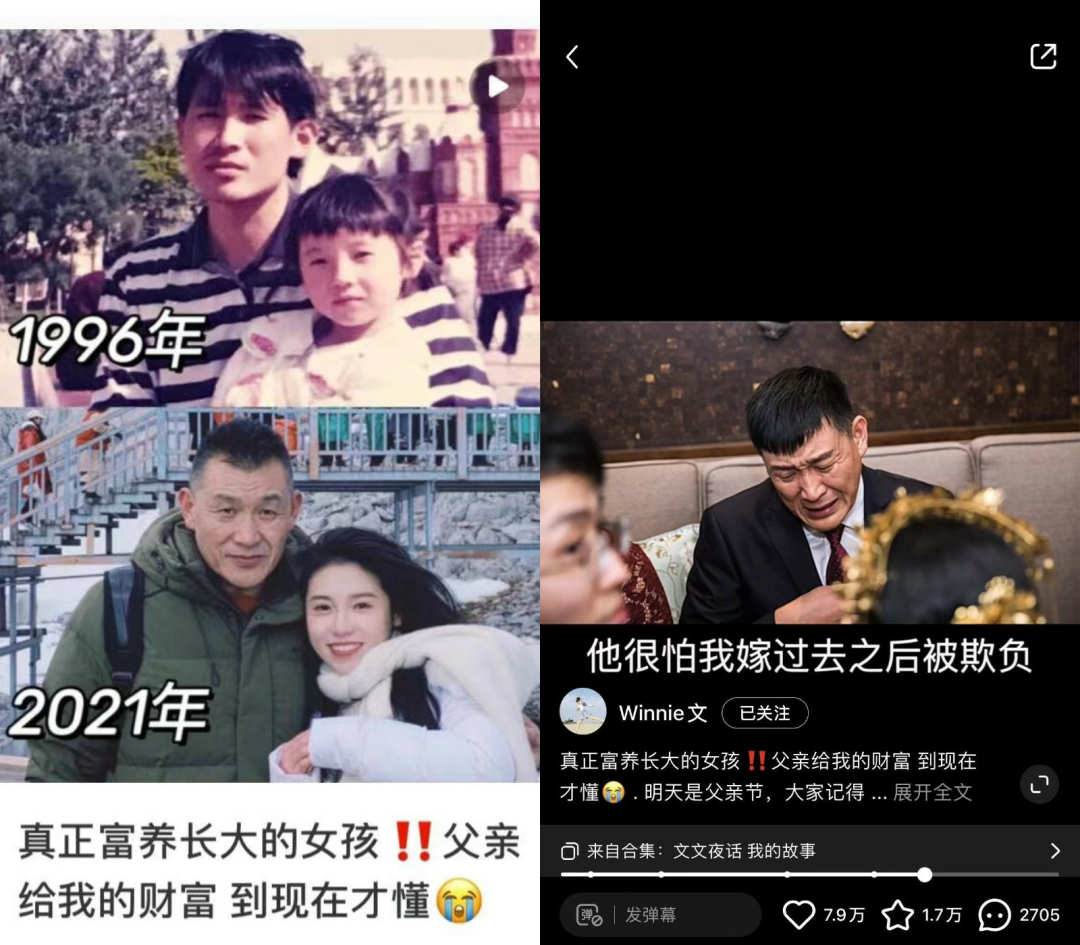 去年我给爸爸做了一篇关于父亲节的内容,主题是“真正被富养长大的女孩”。写脚本的时候就写到哭,视频剪出来的时候也哭,哪怕隔了一年再看我还是会哭。