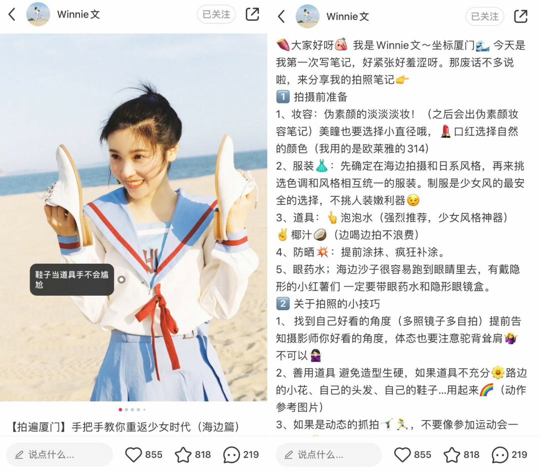 我同时在做兼职模特。一个好朋友说可以试试发小红书@摄影师,能增加照片的曝光。抱着这个想法,2018年5月,我发了第一篇小红书——海边拍照小攻略。