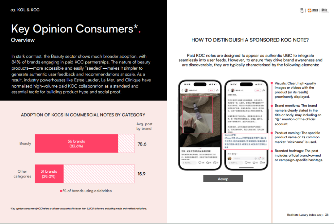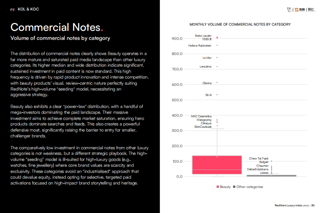 其他奢侈品品类在商业化笔记上的投入相对较低,这并非弱势表现,而是源于不同的战略逻辑。大规模 “种草” 模式并不适合高端奢侈品(如腕表、高级珠宝)—— 这类产品的核心品牌价值在于稀缺性与排他性。因此,这些品类不会采用可能削弱品牌资产的规模化做法,反而会开展有选择性、针对性的品牌激活活动,聚焦于具有高影响力的品牌故事讲述与历史底蕴传递。