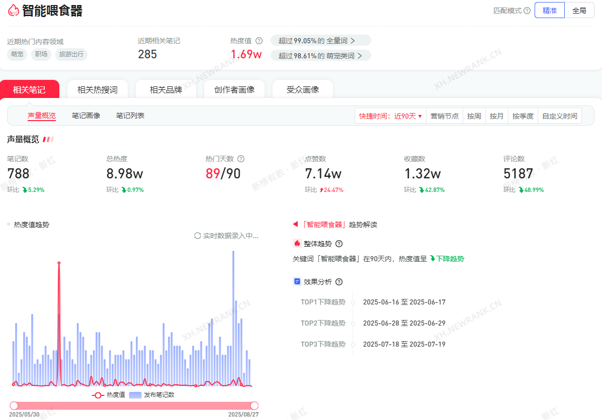 新红的品类热点分析通过 “搜索增速 - 竞争强度 - 内容缺口” 的三角模型,成功挖掘出 “宠物智能喂食器”等多个蓝海赛道。