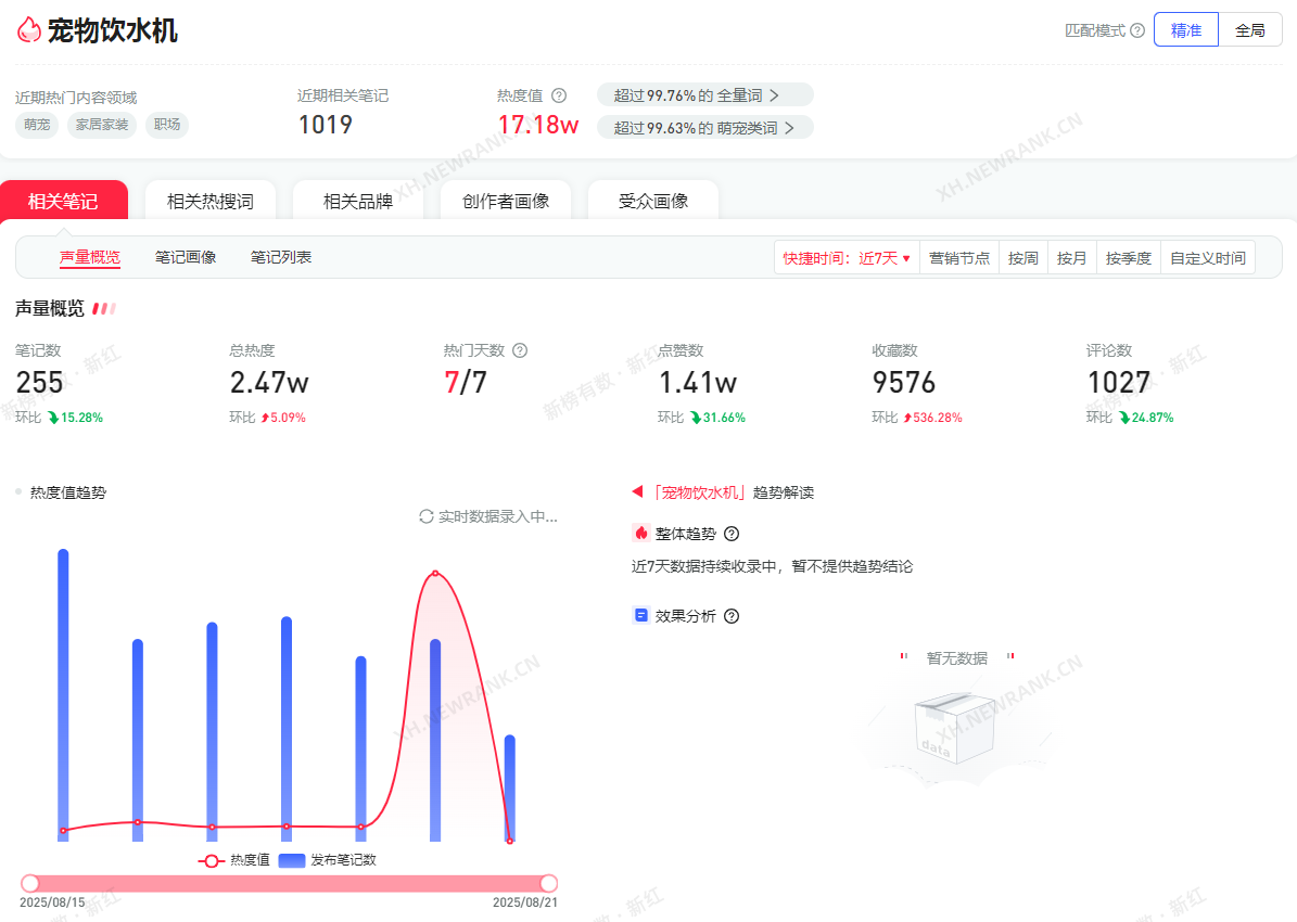 投前决策阶段:通过商品排行、品类热点和竞品店铺分析确定方向。利用新红数据的品类热点分析功能,可以发现如“宠物智能用品”搜索量8月初涨幅明显。