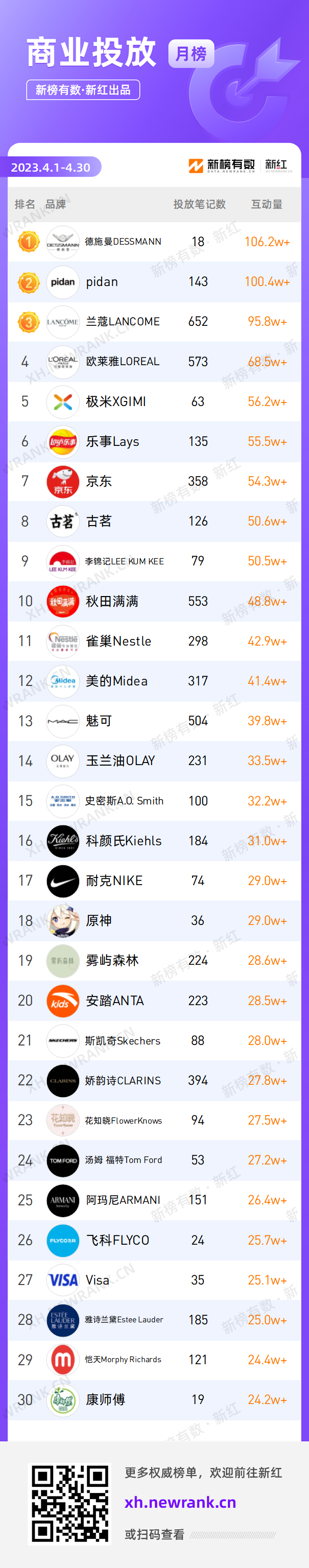 以下是4月『商业投放榜』TOP30的品牌排名情况: