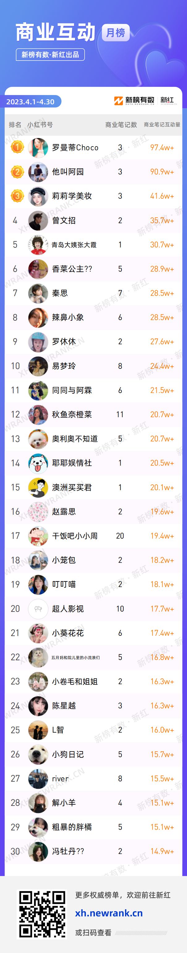 以下是4月『商业互动榜』TOP30的红人排名情况:
